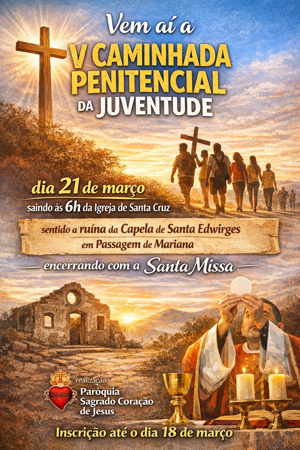 Vem aí a V Caminhada Penitencial da Juventude, dia 21 de março, sábado, saindo às 6h da Igreja da Santa Cruz no Barro Preto para as ruínas da Capela de Santa Edwiges em Passagem de Mariana, encerrando com a Celebração Eucarística. Convidamos todos os jovens dos grupos eclesiais, da catequese crismal, de nossas escolas e outros mais para essa peregrinação jovem e caminhada penitencial. Inscrições e informações na Secretaria Paroquial até dia 18 de março.